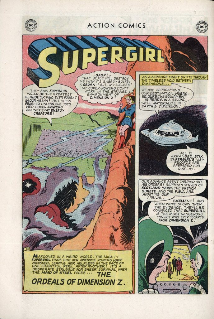 The Supergirl back-up feature fares a little bit better in terms of its action-quotient, though it too wasn’t a story you’d remember for its awesome action sequences. It was also written by Leo Dorfman and drawn by the Maid of Steel’s regular artist, Jim Mooney. It opens with alien agents from the far-off realm of Dimension Z coming to Earth and accusing Supergirl of actually being an escaped criminal from their land, Serpena. They spend the opening few pages convincing the authorities and even Superman of this, showing how Supergirl has been faking her super-powers (which they remove from her by secretly attaching a device that creates Red Sun radiations on her person) and her many terrible crimes as Serpena. Supergirl herself isn’t certain about the validity of her existence by the end of their accusation, and she allows herself to be taken back to Dimension Z as a prisoner.