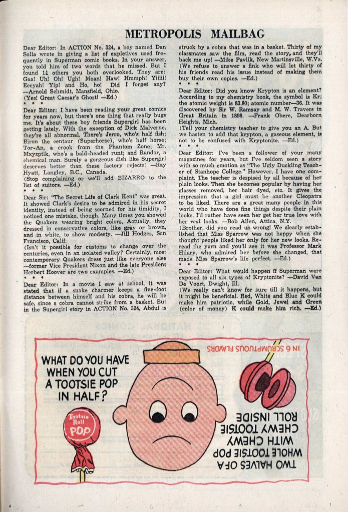 Finally, the 2/3 page Metropolis Mailbag letters page brings up the rear. The answers from the unnamed editor, whether written here by Weisinger himself or his assistant E. Nelson Bridwell, try to be a bit snappier, as though somebody was attempting to internalize some of what Stan Lee was doing across town. Unfortunately, as was so often the case when DC attempted to court a contemporary audience, the artifice shines through. These responses feel just a little bit nastier than they ought to.