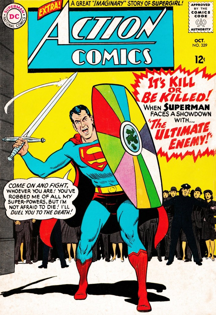 Now this was a cover that promised to live up to the title of the series; ACTION COMICS! Surely if Superman was about to go into a kill-or-be-killed battle to the death bereft of his super-powers and brandishing a sword and shield, the story within was going to be chock full of action, right? Well, wrong. This was another of editor Mort Weisinger’s come-ons to lure in kids. But the story was as safe and sanitized and bloodless as any he ever produced. Still fun, still entertaining, but hardly an example of limitless action.