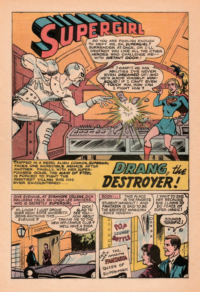 The cover promised that this issue contained a great Imaginary Story featuring Supergirl, but I can find no evidence that the story in this issue was intended to be an Imaginary Tale. o I don’t know what wires may have gotten crossed there. It is the first part of a multi-part adventure, and was written by Leo Dorfman and drawn by Jim Mooney. It opens with Linda Danvers and her quasi-boyfriend Dick Malverne going to see a conjurer at a local campus hangout. The conjurer, Fantasta, selects Linda as the volunteer for a disappearing girl trick. But Linda is genuinely disappeared, finding herself on a space ship on its way to parts unknown.