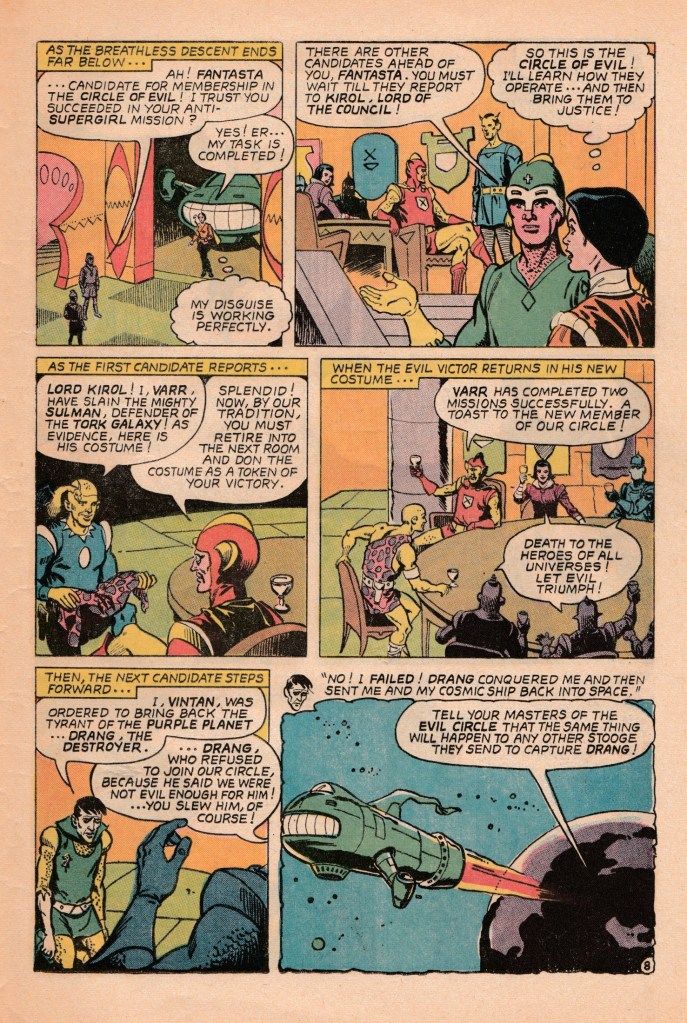 Supergirl learns that Fantasta is actually an alien from the planet Gotha, home of the Circle of Evil. In order to join their nefarious ranks, Fantasta had to prove her merit by defeating Supergirl. When she can’t do it, Fantasta is forced to annihilate herself through the use of an Execution Bird that she was required to carry. Approaching Gotha, Supergirl decides to pose as Fantasta in order to learn more about the Circle of Evil so that she can bring them to justice. On Gotha, Supergirl is shocked to discover that she doesn’t have her super-powers, but she’s able to prove her bona fides to the Circle by claiming to have killed Supergirl and brought them back her indestructible costume as a trophy. For some reason, Supergirl’s costume retains its indestructibility even though she has lost her powers–a mystery.