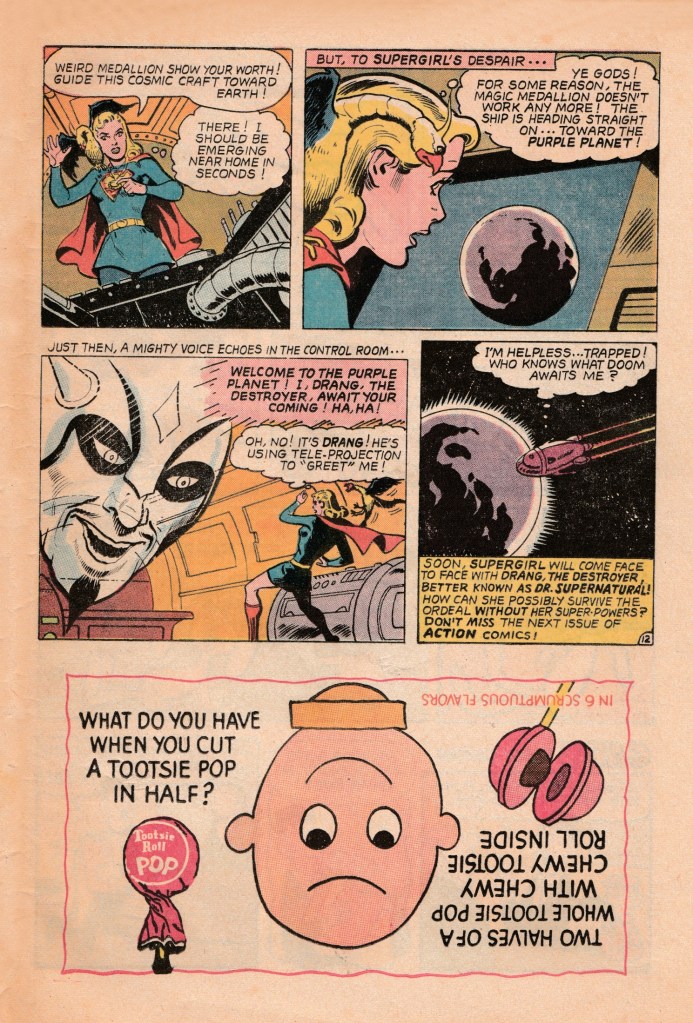Having passed her first test, Supergirl as Fantasta is given an even greater challenge; she’s to proceed to the Purple Planet and capture Drang the Destroyer, a tyrant who refused to ally himself with the Circle of Evil. Drang has already beaten five of the circle’s best–and Supergirl doesn’t have any of her super-powers to help her. Trapped in a spaceship that’s locked on a course to the Purple Planet, Supergirl tries to figure a way to divert its course, but ultimately fails. and as this story is To Be Continued, Drang himself reaches out with a telepathic projection, telling Supergirl that he awaits her coming. Uh-oh. This adventure would continue the following month, though I wouldn’t read it at the time, as that next issue wasn’t among the issues of ACTION COMICS that were a part of my Windfall Comics purchase.
