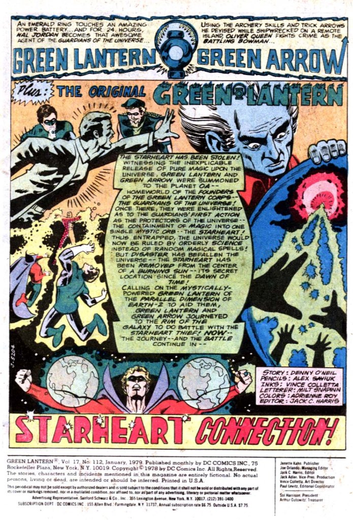 Because this story was repurposed material that was broken in two for this printing, the issue opens with a splash page designed to bring readers up to speed before instantaneously dropping back into the story abruptly. Suffice it to say that somebody has stolen the Starheart, a repository for all of the magic in the universe that was sealed away by the Guardians, the creators of the Green Lantern Corps. Tasked with locating the thief and retrieving the Starheart, Green Lantern and his pal Green Arrow call in the specialist assistance of Alan Scott of Earth-2, since his Power Ring is magical in nature and will more easily allow them to track down and cope with the Starheart’s power.