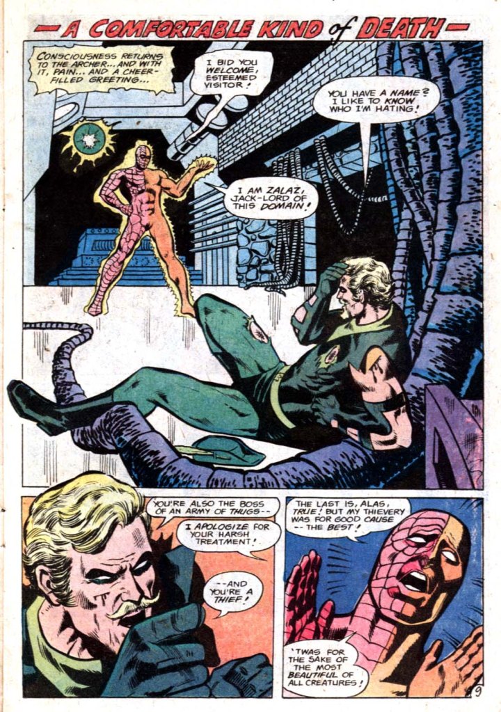 The trail of the stolen Starheart takes the trio across the universe, where they finally locate a strange planet that seems divided down the middle. One side is modern and technological, the other is mediaeval and mystical in nature. Before the heroes can get their bearings, they’re zapped from below. Hal Jordan ends up falling beneath the surface of the magical side while Alan Scott does the same on the technological side. And Green Arrow just slams down on the surface, where he’s almost immediately accosted by both pseudo-Stormtroopers from the science half and angry trolls from the magic half. Dispatched, he later wakes up before the master of this strange planet: Zalaz, who calls himself the Jack-Lord.