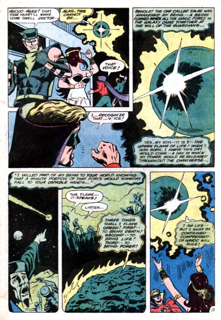 Anyway, the story has now run out of pages, so on the very last one, Z’La merges with the Starheart, intending to contain it and replace it where it was safely kept at the heart of a star. Before she goes, she instantly transports the three heroes back home–so we don’t really get to see any of Alan Scott’s reaction to the revelation that the source of his power came from this Earth-1 magic item. And that’s the ballgame. This ending is so abrupt that I kind of wonder what happened here. Even with this being repurposed from elsewhere, surely these events wound have warranted two pages in any outline, yes?