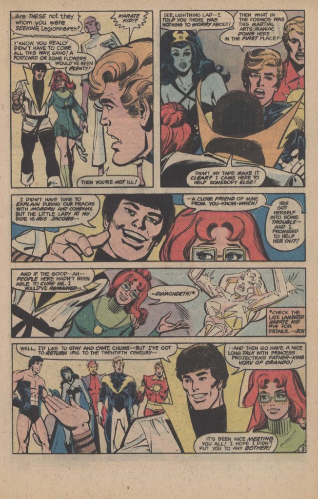 The opening story was plotted by Paul Levitz and scripted by Len Wein, and was done in part to clean up a dangling plot thread from Karate Kid’s short-lived solo title which had ended a little while before. Both stories in this issue were illustrated by Joe Staton, whose work I always found very appealing, though the choice of inker could sometimes have a detrimental effect on his work. In this lead-off tale, he’s inked by Dick Giordano, who does a nice job with it. Anyway, the story opens with a team of Legionnaires seeking out Karate Kid on Mercury, where they’ve heard that he checked into a Medivac-Lab where incurable diseases are treated. Fearing the worst, the Legionnaires are relieved when Karate Kid appears, telling them that the person so stricken was Iris Jacobs from the Twentieth Century, who would transform into the homicidal Diamondeth until 30th Century science cured her of her condition.
