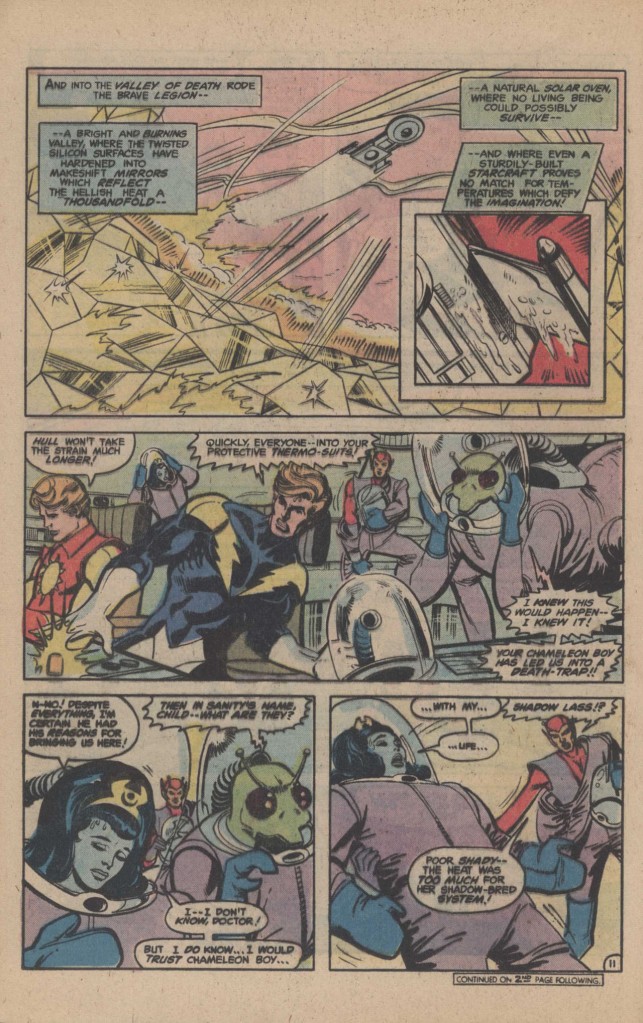 While the Legion is there, Dr. Zebx asks for their assistance with another problem: the personnel of the Medivac unit has been disappearing. Staging a stake-out the Legionnaires are surprised by and fight off an invading robot that turns out to simply be an explorer droid created to survey the surface of Mercury. What’s worse, while the battle was going on, more people have disappeared. At this point, the temperature-sensitive Shadow Lass feels a sudden chill, and this gives Chameleon Boy a clue as to what is actually going on. He has the Legion and the lead Doctors from the Medivac Unit fly to the warmest spot on mercury aboard a Legion Cruiser. But the cruiser begins to melt under the intense heat, causing everybody to have to bail out from it.