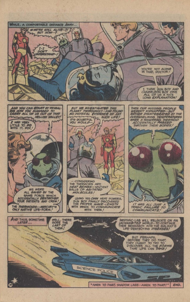 Cham has talked his theory over with Sun Boy, and it’s at this point that Dirk Morgna comes to the fore. He uses his control of heat and light to make contact with the indigenous life forms of Mercury, the Thermoids, creatures made of sentient immaterial molecules. Those people who disappeared were accidentally incinerated by contact with a random Thermoid who happened to pass through where they were standing. Now, how nobody noticed these creatures for however long it too to establish and staff and build the reputation of the Medivac-Lab is a bit of a mystery, but the resolution here is that sun Boy is able to communicate using his powers and lets the Thermoids know what they’ve been unintentionally doing. And consequently, Medivac will need to be relocated to some other inhabitable world. But at least no more people will disappear and die.