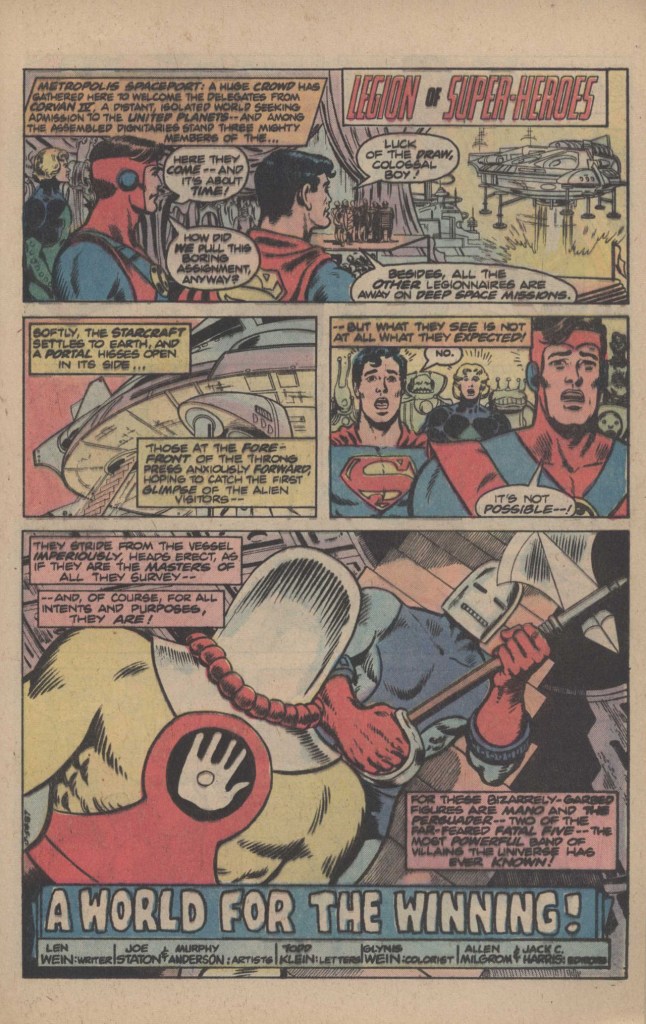 The back-up story was entirely written by Wein and illustrated by Staton with Murphy Anderson inking. It opens with the world of Corvan IV sending delegates to the United Planet to negotiate that world’s entrance into the United Planets. The Legion is on hand to provide security–but they are stunned when the delegates turn out to be Mano and the Persuader, two members of the notorious Fatal Five, resolute enemies of the Legionnaires and wanted intergalactic criminals. Wasting no time, the Legion team leaps to the attack, and are held off by the two villains. But at a pause in the battle, the Persuader offers the fallen Superboy a hand up, and the devious duo proclaim that they are here legitimately, to speak on behalf of Corvan IV.