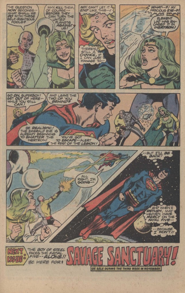 Mano and the Persuader surrender themselves to the authorities until the legitimacy of their claims can be verified. To this purpose, the Legion squad is dispatched as envoys to Corvan IV. On the planet, the other three members of the Five, Tharok, Validus and the Emerald Empress give the Legion members a tour of that world, showcasing how they’ve improved the lives of the inhabitants whom they’ve introduced to higher technology. But the Legion see this as a bad thing. They feel that the people of Corvan IV are suffering from culture shock, from being delivered too many advances in too short of a time, and they therefore reject the plea for United Planets membership. Accordingly, the Fatal Five (well, three) attack, and swiftly take down all of the Legionnaires save Superboy, who is held at bay by the Emerald Empress’ cosmic eye. Element Lad encases the Eye in Inertron to hold it momentarily, giving Superboy the moment he needs to race away from the planet to safety. As the issue comes to its To Be Continued end, Superboy vows to contact the rest of the Legion and return to vanquish the Fatal Five and save his captured comrades. And we all know how that worked out in #247 a month later.
