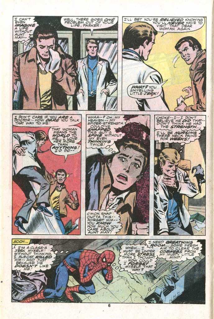 The big development that opens up this issue also served as a bit of set-up to Marv’s gradual build-up to the not-too-far-in-the-distance ASM #200. Namely, Peter Parker’s Aunt May is moved into a nursing home due to her ongoing medical woes. Peter’s often been caught up in his responsibility as Spider-Man to where he’d miss appointments to visit his Aunt, and here one of her physicians makes a snide comment in Parker’s direction about this. Peter loses his grip and almost totals the guy for it, then comes to his senses and realizes that he’s acting like a bit of a jerk. It’s a good little moment.