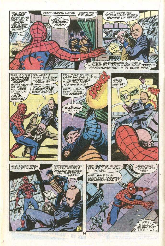 Elsewhere, J. Jonah Jameson is dealing with his own pressures. His son John Jameson has been abducted from the hospital, and the word Robbie Robertson has picked up from his sources indicates that the party responsible holds a grudge against both Jameson and Spider-Man. Marla Madison, the woman who built the fourth Spider-Slayer for Jonah and who would one day marry him, comforts him as he grapples with his helplessness. Back on the streets, Spider-Man comes across a robbery in progress and crashes in. But just a second later, a S.W.A.T. team simultaneously bursts in, and Spider-Man’s involvement almost causes a tragedy to happen. The S.W.A.T. leader tells Spidey to vamoose, that they don’t need the help of blundering amateurs. The wall-crawler may no longer be actively wanted by the police but that doesn’t mean that his relationship with them is rosy.