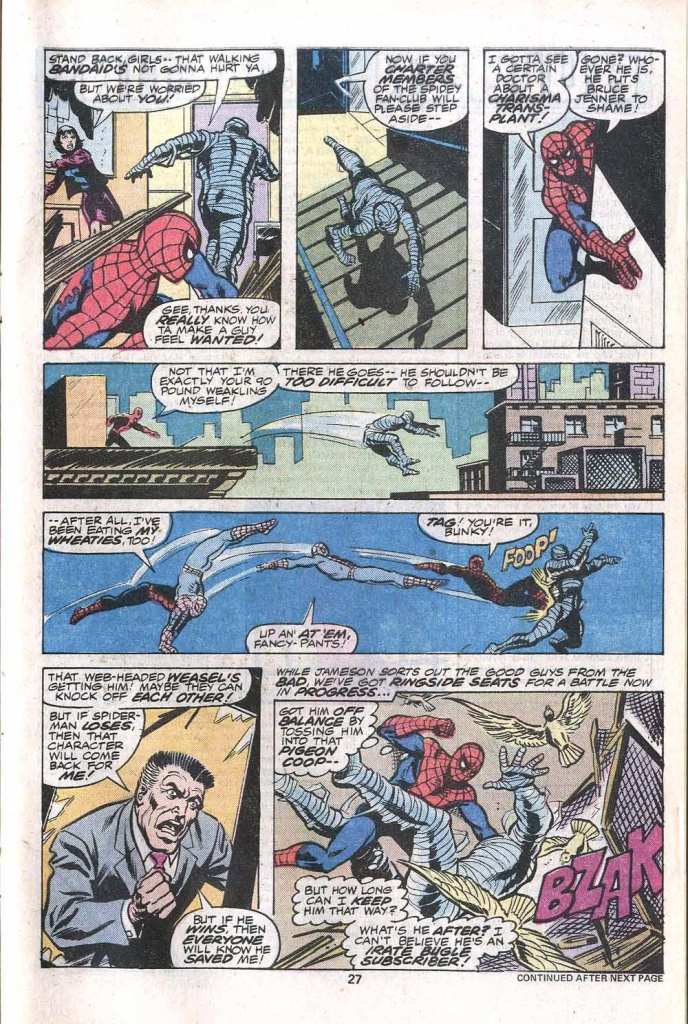The camera cuts away from Peter and Betty at this point, and picks Spider-Man up a few hours later, swinging across the city and contemplating where he stands with Betty. But as he crosses town, he comes across a figure scaling the outer wall of the Daily Bugle building towards Jonah Jameson’s office. This is the mummy-man, and Spidey gets the drop on him, bursting in just as the gauze-wrapped minion attempts to grab Jonah. This leads to a running fight across the rooftops in which the wall-crawler can’t seem to put down his silent foe (despite the balloon on the cover, the bandaged figure never speaks within the story proper), and Jonah isn’t entirely sure who he should be rooting for, a common Jameson trope at this point.