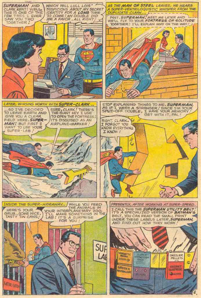 The story begins with the mysterious Baron X having stolen a number of nuclear warheads. Clark Kent becomes Superman in order to track down the Baron, but he’s caught in a nuclear explosion that somehow splits him into two beings, a superman and a similarly powered Clark Kent. After first fighting with one another to determine their bona fides, Superman and Kent team up to scour the Earth for Baron X. But the quest ends in failure, though Clark does manage to recover the stolen warheads, much to the gratitude of President Lyndon Johnson, who assumes that Superman did the deed. Traveling to the fortress of Solitude, Kent announces that he intends to leave the Earth to give Superman his space. But before he goes, he’s created a gift for his other self: a miraculous belt based on Batman’s utility belt. (The BATMAN television series was a huge hit at the time this issue came out.)
