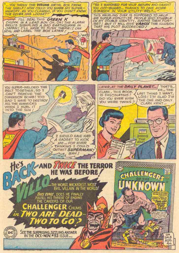 The belt is a huge hit with Superman, who uses it over the next few days as he goes about his tasks. But “Clark Kent” isn’t a duplicate of Superman at all. He’s really escaped Phantom Zone convict Vakox who worked with Baron X to get free of the Zone and who adopted the Clark Kent persona as a way to ingratiate himself with Superman. The belt is actually a trap designed to project Superman himself into the Phantom Zone and then to detonate, throwing the entire Zone into a distant dimension from which there can be no return. But Superman is on to the plot thanks to a tiny mistake that Vakox made in the Fortress, and he arrives to put the evil scientist back into the Zone. As for the belt, Superman is forced to destroy it, as he cannot separate the Phantom Zone trap from it. So no matter how wonderful it was, into the sun it goes.