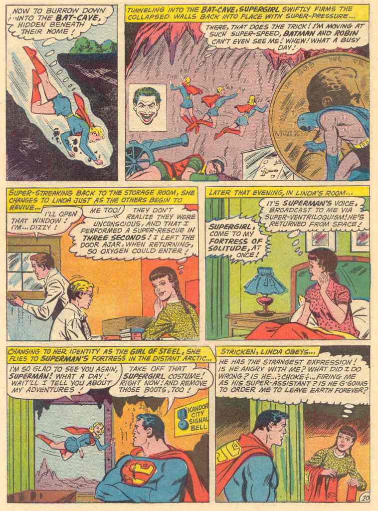 This story takes place during that period before Supergirl’s existence had been revealed to the world, and she was operating in secret. Here, Linda Lee laments the fact that she doesn’t get to go into action all that often, and as if in reply, she’s faced with a day that has her rushing from one emergency to the next, due to teh fact that Superman is off on a space mission, and so she has to pick up the slack. It’s also a rare story in which Batman and Robin appear outside of their own series or WORLD’S FINEST, as one of Supergirl’s missions is to rescue them from a cave-in at the Batcave.