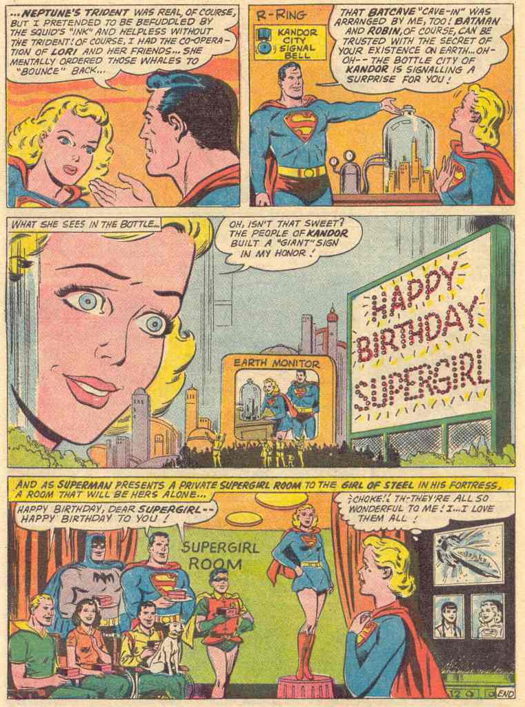 The whole situation has of course been set up by Superman, both to challenge his young cousin’s wits and to keep her too busy to remember that today is her sixteenth birthday and too distracted to notice the celebration he is putting together for her. All of the various characters who are in jeopardy, including Lori Lemaris and Krypto and Batman and Robin are all in on it. It’s a nice tale, and it has a good deal more action than the lead story, though that action is once again very sedate and matter-of-fact in its presentation. But it gets the job done. Still, the inclusion of reprints such as this one in a mainstay title like ACTION COMICS feels a bit like a grift, even if the common knowledge of the period suggested that the readership for comic books turned over every three years or so, and so the current audience wouldn’t have read this tale when it first came out.