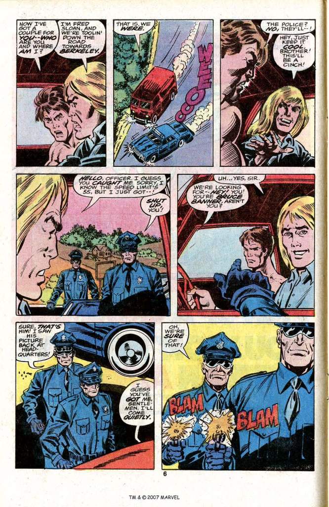 As the issue opens, Captain America and his seeming allies Marvel Man and the Vamp are following a lead on the whereabouts of the Falcon, who was captured by the Corporation some time ago. I say seemingly because the Vamp is actually a traitor–she’s working for the Corporation, and has battled Cap in her other persona as the cavemanlike Animus. The trail has led them to the disused prison on Alcatraz, which the Corporation has repurposed for their own designs. Elsewhere, activist Fred Sloane and his passenger the Incredible Hulk are still being pursued by the police following the green guy’s destruction of a checkpoint intended to stop them. As a police cruiser closes in on Fred’s van, he’s surprised to see that his passenger has relaxed and transformed back into his Bruce Banner self. What’s more, that cruiser isn’t maned by regular cops, but rather agents of the Corporation. They’re able to tranquilize both Sloane and Banner and take them prisoner.