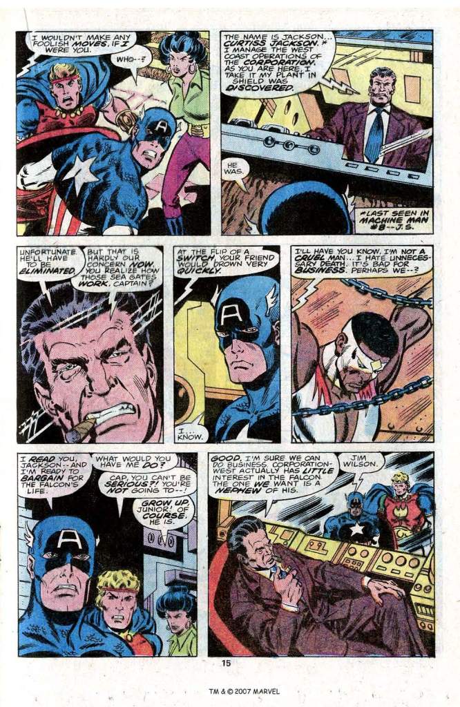 Meanwhile, Cap and his team infiltrate the corporation’s base, coming across the Falcon strapped to the far sea gate and threatened with drowning. Curtis Jackson, the West Coast head of Corporation activities asks for Cap’s surrender, or else he’ll flood the area and Sam Wilson will perish. Jackson’s objective for some time has been to get his hands on the Hulk’s friend Jim Wilson, who it turns out is of course the nephew of the Falcon, who shares the same last name. Comics, am I right? Jackson’s men have also captured the Hulk, and are keeping him docile in his Bruce Banner form. Anyway, before Jackson can conclude his business with Cap and company, another party enters the base with the much-in-demand Jim Wilson in tow. This is Kligger, who up until recently was also using the identity of Senator Eugene K. Stivak. Kligger works for the East Coast branch of the Corporation, and he and his associate Moonstone have been trying to kill Captain America for a number of issues. Kligger proposes a trade with his West Coast counterpart: Jim Wilson for Captain America.