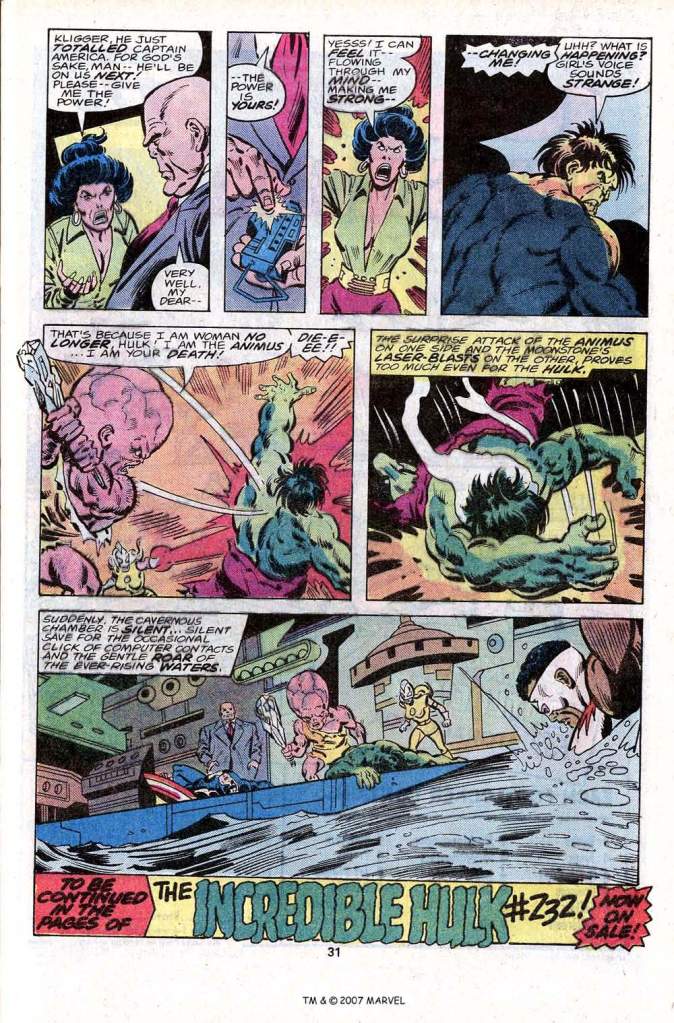 With his back to the wall, Jackson plays his last card: he opens the sea gate and lets the water rush in. At the same time, Kligger activates the Vamp, triggering the process that transforms her into the savage Animus. So the Hulk clobbers Captain America and then Animus strikes down the Hulk from behind. And that’s where this story is To Be Continued, but in the next issue of INCREDIBLE HULK rather than the following installment of this title. This manner of cross-pollination between books was something of a Marvel trademark in this period, and I’d encountered similar things before at DC, notably the intersection of SUPER-TEAM FAMILY and SECRET SOCIETY OF SUPER VILLAINS during the “Atom’s Quest” storyline. But this was, I believe, the first time I’d come across it in the Marvel line, which made it seem like more of a big deal. As I was already buying INCREDIBLE HULK, all I had to do at this pint was settle in and wait for a week or two to go by before I’d be able to read the conclusion.