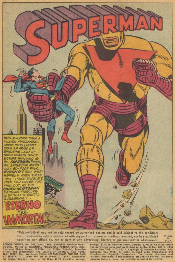 Jim Shooter has become something of a divisive figure in comic book circles, simultaneously praised for his many accomplishments and excoriated for his assorted failings. But one thing that you absolutely have to give him is his talent was vast. He broke in as a writer at DC when he was only 13 years of age (editor Mort Weisinger didn’t realize that Shooter was that young when he bought his first few stories) and he spent five years of his youth being verbally abused by the editor as he continued to work for him, selling stories to help out his impoverished family. One of Shooter’s complaints about the Legion of Super Heroes, the first series that he took over, was its lack of physical action, so he set about to bring in some characters who would buck that trend, notably Karate Kid. Here on superman, it appears he felt the same way, that the Man of Steel wasn’t being faced with foes who could stand up to him and give him a tussle. Thus, the introduction of Eterno the Immortal.