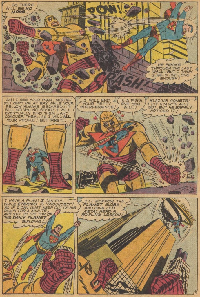 Eterno is half-android, half-robot, standing 50 feet tall and created to be indestructible by the Xan, a pre-human society that once inhabited the Earth. When the civilization of Xan was threatened, Eterno was dispatched to the center of the Earth to bring back the rare element that could save it, but the stuff paralyzed Eterno and so the Xan people were wiped out and forgotten. In the present, having become aware of this history, the Superman Revenge Squad, a consortium of space-villains all of whom had been undone by the Man of Steel over the years, decide to free Eterno and use him to destroy their enemy Superman. And indeed, upon reaching the surface once more, Eterno does battle Superman physically–there’s a lot more action in this story that we’ve been used to, albeit action that’s drawn by Wayne Boring, who had been the principle Superman artist of the late 1940s and most of the ’50s. Boring’s style was a bit old-fashioned looking, and so his action sequences here are a bit stiff and unconvincing.