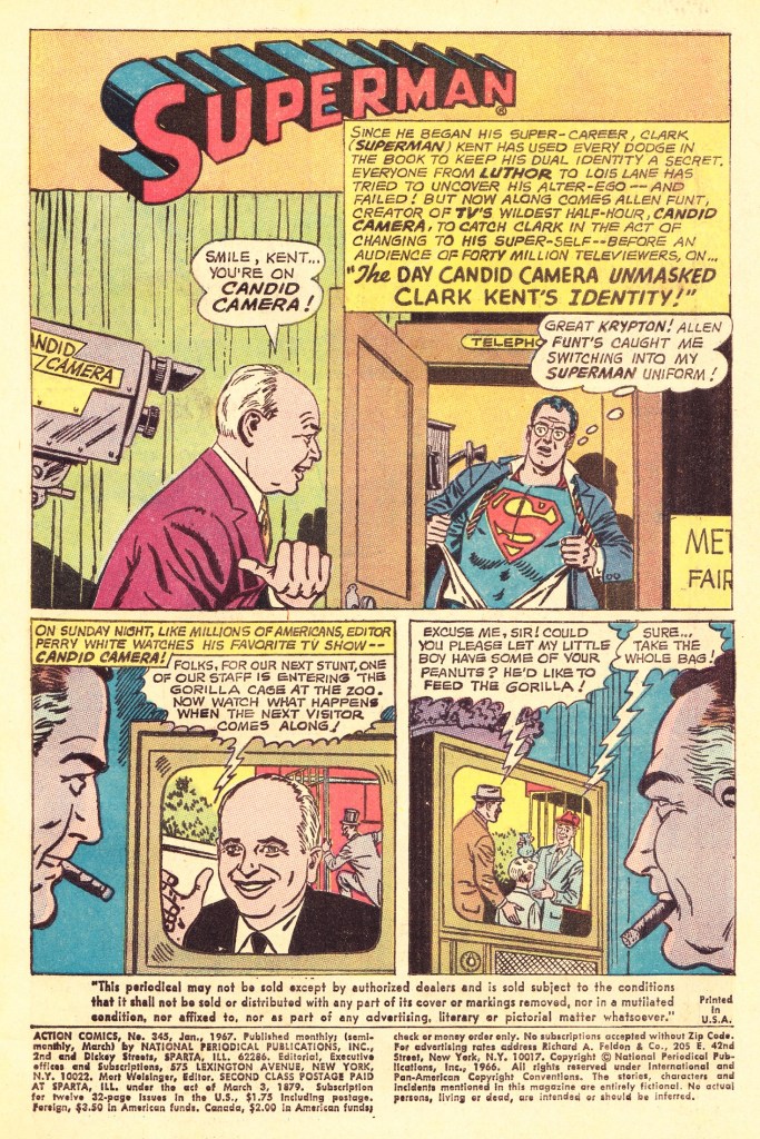 For those who’ve never experienced it, Candid Camera was a program that focused on “embarrassment entertainment”. The producers would set up some ridiculous situation, have some unsuspecting ordinary person walk into it, and film the results with a hidden camera. The victim being confused and reacting with shock or horror or looking foolish was the desired result. It was a popular series and it ran for many years, well into the 1970s. And Mort, I suppose, figured that it might be just the thing to give Superman and ACTION COMICS a boost.