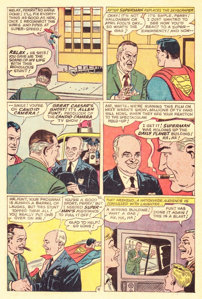 The story opens with Daily Planet editor Perry White watching his favorite program, candid Camera, when he gets a phone call indicating that the Planet offices are being held up. Racing to the offices, Perry is dumbfounded to find only an empty lot–Superman is flying in the sky, having pulled the entire structure off its foundation and flown it aloft. But this is all a Candid Camera gag on Perry, and Allen Funt appears to let him in on the joke. Apparently, this winds up being one of the most successful bits Funt has ever put on the show, and so he and his staff decide to play a few more pranks on the Planet staff. Specifically, he’s going to pull a prank on Clark Kent, and because the story requires it, while the candid Camera bits are typically filmed beforehand, this one he’s going to broadcast live.