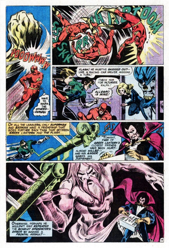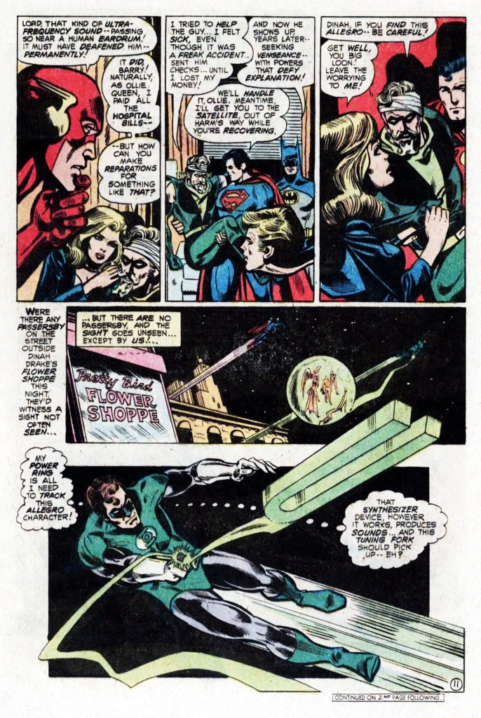 It turns out that Green Arrow knows his assailant, and once he’s recovered his wits, he can tell the shameful story to his partners. Years ago, in the days before he lost his fortune, Oliver Queen was visited by Allegro, who wanted him to invest in his creation, a synthesizer that could make sound solid. Ollie turned the man down–and shortly thereafter, when Green Arrow was battling some criminals, bystander Allegro was caught by a misdirected sonic arrow and had his hearing destroyed. So he’s got some pretty good reasons for going after Queen and the other men who drove him into poverty and despair now that he’s completed his device. The Flash, Green Lantern, Batman and Black Canary track Allegro to the home of his former manager, where he’s determined to kill the man with his sonic apparitions.