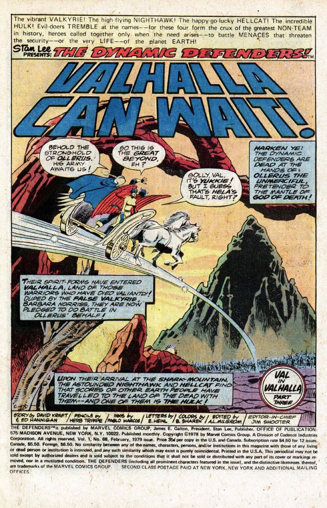 So a quick recap of where we are: the Defenders are in Valhalla, the Land of the Dead, where they’ve thrown their lot in with the forces of Ollerus the Unmerciful, who is looking to unseat Hela as the ruler of the realm. This is because Valkyrie, their comrade, has asked for their aid in this conflict. Except this isn’t the Valkyrie they know. Unbeknownst to them, it’s the insane spirit of Barbara Norris, the earthwoman in whose spirit Val’s had resided, now made over into a duplicate of Val (albeit attired in a different costume.) The real Val has been fighting on behalf of Hela in this conflict, so her fellow Defenders are unknowingly helping out the bad guys.