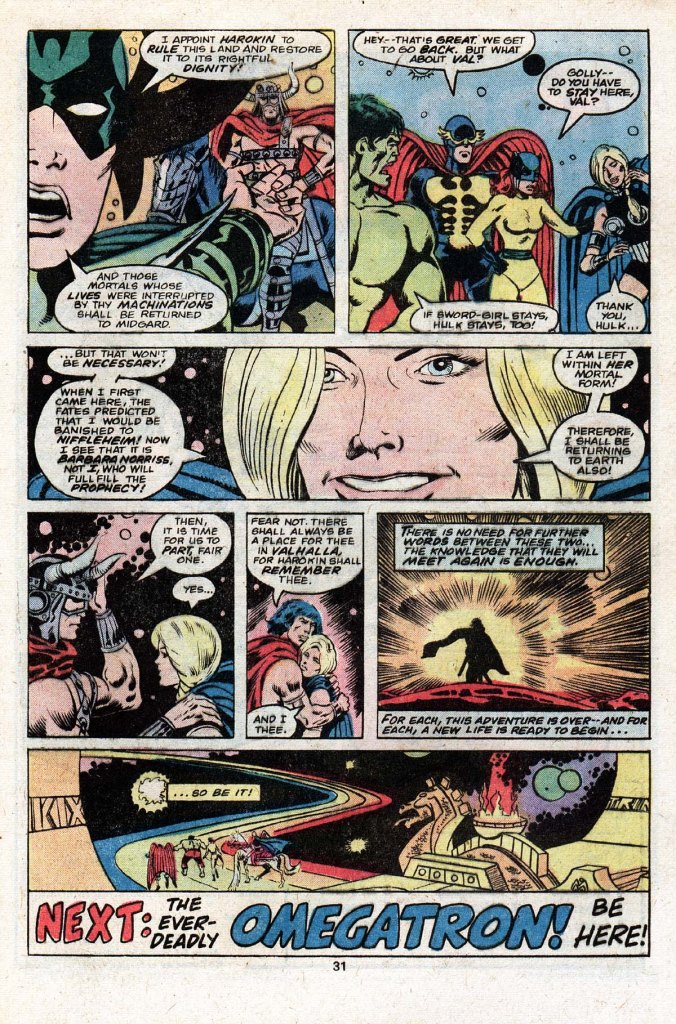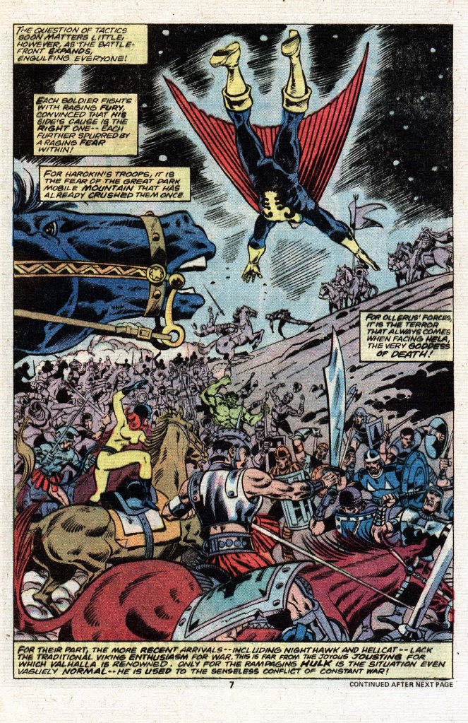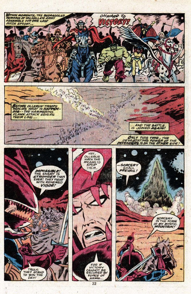 So at this point, the Defenders switch up sides, throwing in with the real Val as well as Harokin, the leader of Valhalla’s army. With their power added to the realm’s defenders, Ollerus finds his advance thwarted. But he’d still got one ace to play: his mobile Mystic Mountain, which has served as his headquarters and stronghold. He causes it to advance into the heart of Valhalla, using it to crush all resistance before him.