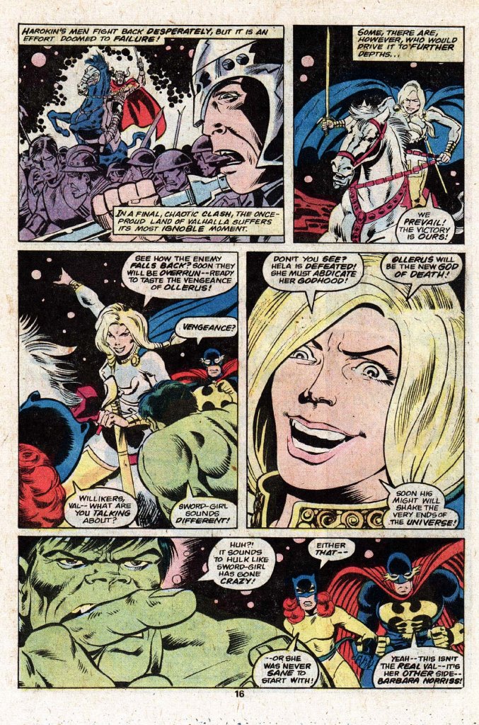 Things are going well for Ollerus, too, as his legions continue to advance, overwhelming Hela’s defensive army of warriors from Valhalla. Hela has petitioned Odin for aid, but the All-Father tells her that he’s going to stay out of the internal affairs of Niffelheim and let the cards fall where they may. If Ollerus takes Valhalla, so be it. And during the battle, the Hulk is shocked to see two Valkyries, but his simple mind assumes that the newcomer, the true Val, must be an impostor, and lays her low with a well-hurled boulder. This impression doesn’t last long, though, as Barbara Norris is completely out of her mind, and even the Hulk can tell that she’s not his friend Valkyrie.
