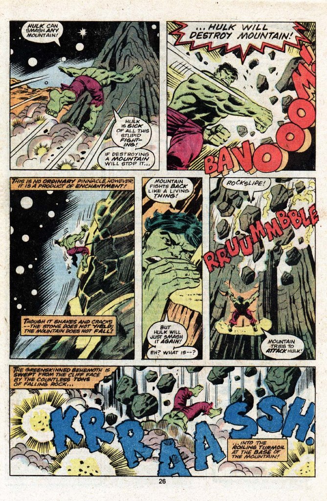 It looks as though Ollerus’ forces have won the day as the Valhallan army is crushed and scattered by the unstoppable mountain. They have nothing within their arsenal to counter its power. Well, almost nothing. The single-minded Hulk hurls himself at the mountain, and with pure brute force smashes his way into it. He’s eventually able to locate the nexus of mystical energy that is animating the structure, but he can’t really do anything to smash it. So he does the next best thing: completely shattering and destroying the entire mountain itself with his bare fists.