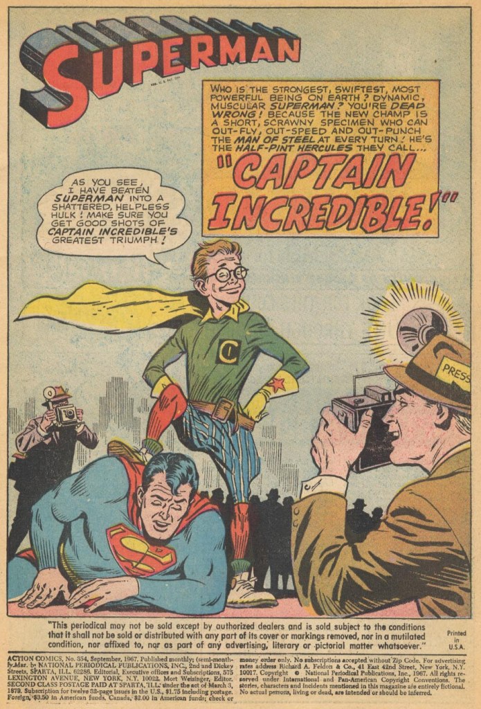 This entire story is a bit of a pastiche inspired by a short-loved super hero television series. After BATMAN had proven to be a colossal hit, both rival networks NBC and CBS raced to produce their own knock-off funny super heroes. In perhaps one of the most unfortunate coincidences of scheduling, both networks chose to air them at the same night at the same time–so they wound up competing directly with one another. What’s more, both of them used a similar concept, about a mild mannered guy who would gain super-powers after taking a pill and use them to ineptly fight evil. CBS’s entry was MISTER TERRIFIC, while NBC put forward the (better) CAPTAIN NICE. William Daniels starred as the Captain, and his series only lasted for a single season. Apparently, Mort Weisinger felt that what was good for the goose, and so he commissioned Bates to do a story in which Superman contended with a similarly nebbishy super-character. By the time this issue of ACTION COMICS hit the stands, though, it was kicking a beaten man as CAPTAIN NICE had been cancelled, its last few rerun episodes were coming to an end.