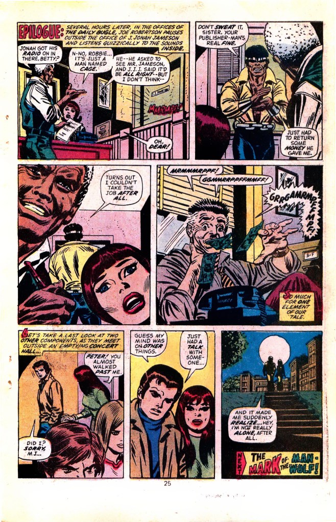 Otherwise, the story by Gerry Conway is a blatant plug for the House of Ideas’ new character, Luke Cage, Hero for Hire. But despite that fact, it works really well. Having chosen (of course) to blame Spider-Man for the death of his friend Norman Osborn–some mysterious figure stripped off Norman’s Green Goblin costume before his body was found, maintaining the secret of his criminal dual identity–Daily Bugle Publisher J. Jonah Jameson needs an agent to bring the wall-crawler to justice. Hearing about the new hero in town, and the fact that he offered competitive rates, Jameson recruited Cage to bring in Spider-Man.