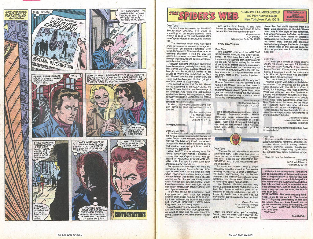 Tom’s “last issue” of his initial long-term following of ASM looks like the change to that cool, oversized right foot corner box Spidey. The previous corner box Spidey was also iconic (which of them really wasn’t?) but the proportions were all balanced, nothing as exaggerated as the right foot on this one. I think both were memorable & fan faves. And the corner box went back to that previous figure in the 250’s again, before the black suit took over the corner box…