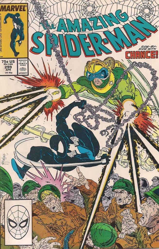 The issue that brought me back to AMAZING SPIDER-MAN was this one, #298. And this was entirely due to the work of artist Todd McFarlane. I had noticed Todd when he was penciling INFINITY INC. over at DC and really liked his design-oriented page layouts, even though his work was being absolutely buried under Tony DeZuniga’s harsh, heavy finishes. When Todd started working on INCREDIBLE HULK, that compelled me to give that book another chance as well, so it was natural that I’d follow him here. Ironically, I almost missed the next issue, #299, as its cover was so similar in color to this one that I skipped it, thinking it was the issue I’d already bought and read. A good lesson for all prospective comic book editors: make each subsequent cover a different color!