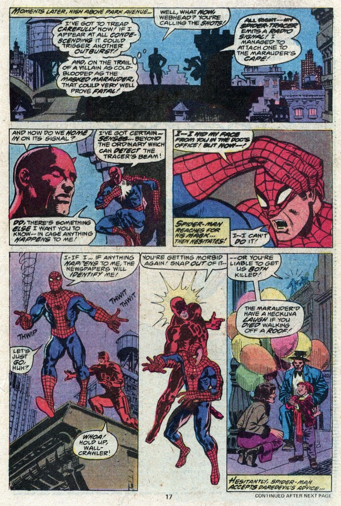 Buoyed somewhat by this news but still agitated by the thought that the Masked Marauder and his Maggia goons are up to something big, Spidey indicates that he’s the only one who can track them down, thanks to the spider-tracer he hit the Marauder with. Spidey’s still not right, but Daredevil decides to buoy his fellow hero’s confidence by racing around the city with him until they can locate the Marauder. At a key point, Spidey decides that he needs to reveal his true identity to Daredevil in case anything happens to him. But he just can’t bring himself to take off his mask (not that it would have meant much to the sightless Daredevil anyway.) It turns out that Daredevil’s own heightened senses are capable of picking up the signal from the spider-tracer, but he keeps that information to himself to give Spidey a sense of purpose and need, and keep him from spiraling into self-pity.
