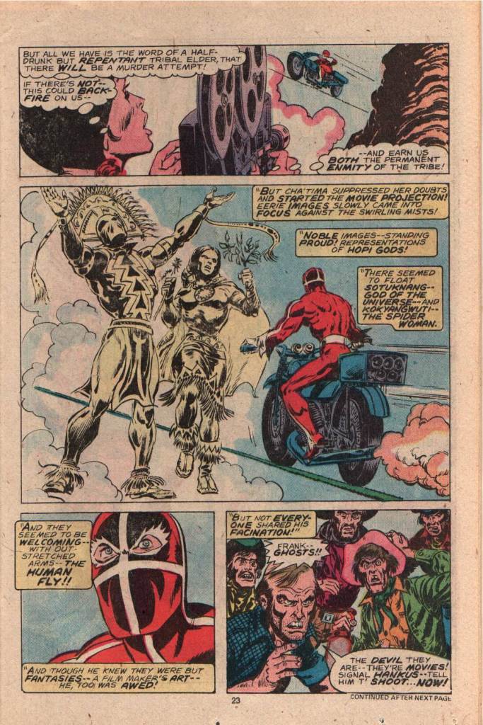 The story in this issue concerns the Human Fly–a stuntman and performer based on an actual real world person, hence the tagline “The Wildest Super-Hero Ever–Because He’s Real!”–is set to do a benefit show on behalf of the Hopi tribe of Las Cruces. But the performance is a set-up by local bigshot Frank Sturgis to swindle $10,000 from the Tribe’s treasury. And last issue, as he learned more about what was really going on in this region, the Fly and his friends were set upon by goons working for Sturgis. As this issue opens, the fight continues, with the Fly proving to be a match for the assailants.