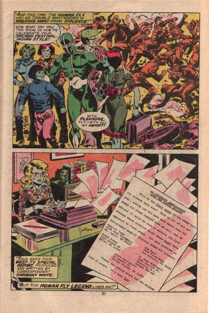 It would have been a hell of a thing if they had killed off the Human Fly in this last issue, but such was not the case. Thinking quickly, the Fly activates his bike’s rockets, which are used to provide him with extra thrust during long jump stunts. They’re able to break his fall just enough so that he survives the crash, even as the bike is totaled. In the aftermath, the Fly is able to unite the tribe against their oppressor Sturgis–they capture the would-be assassin and then go after Sturgis and his men as a group, their mob beating the absolute hell out of them as the Fly walks away, feeling pretty good about himself. I don’t know that this really counts as a heroic win, but it was what it was, and it’s always fun to see bigots get their comeuppance, so I let it slide. This final page also announced the winners of a now-moot contest to come up with a daring stunt for the Fly to perform.