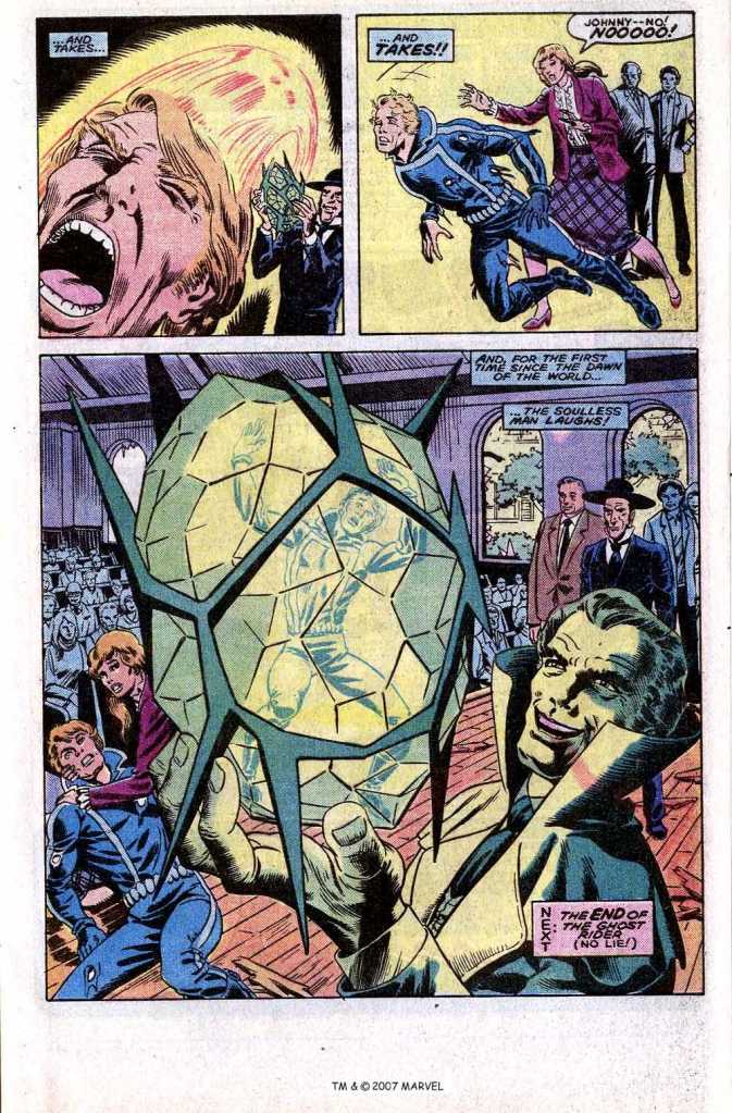 Tis issue ended with Johnny Blaze having sacrificed his soul to Centurious in order to save that of others, and he’s trapped in this mystic gem. I get the feeling that DeMatteis and Budiansky hadn’t been aware that the next issue would be their last when they plotted this. As I recall, they were given a double-sized issue to wrap up their plotlines, which may have been necessary given where they were in the story and the desire to bring Johnny’s story to a definitive conclusion.
