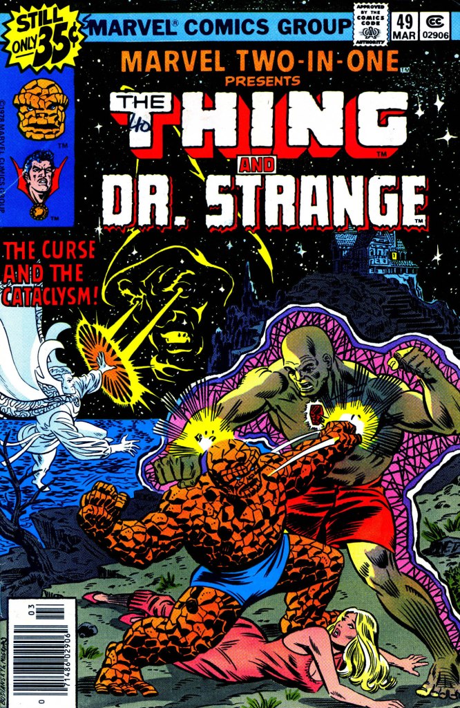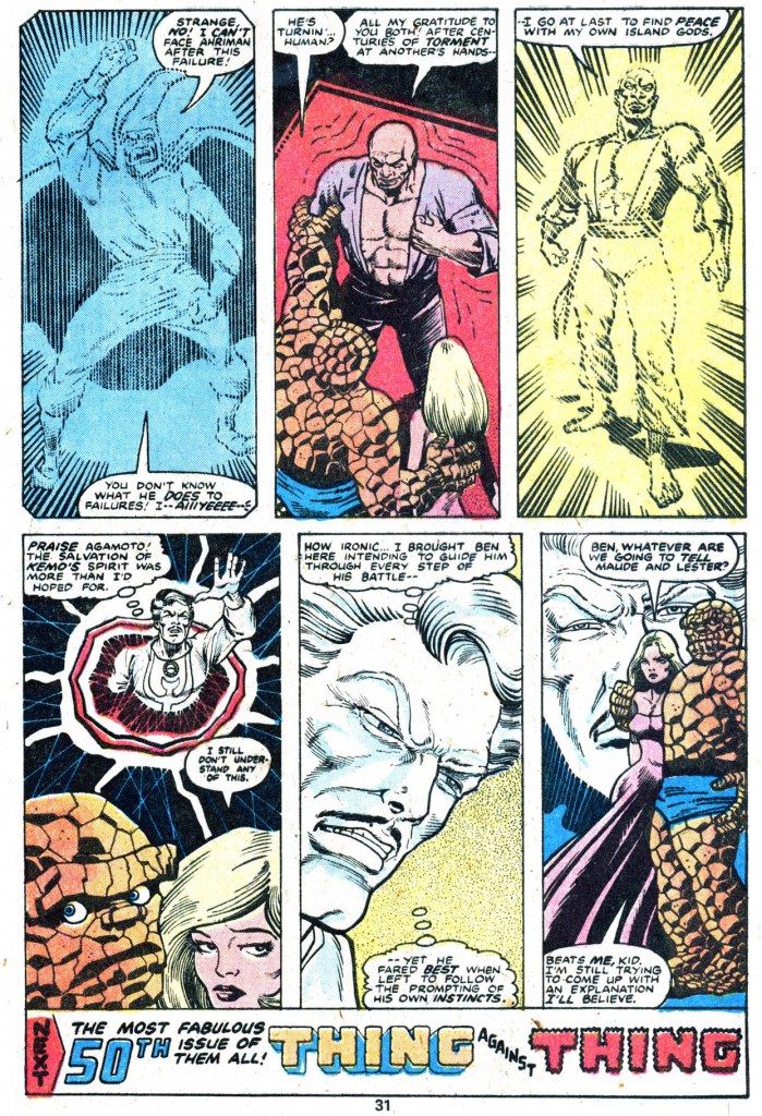 Ben, though, has been around the block a few times, and he’s worked out that it must be the gem embedded in Kemo’s chest that’s animating him, so he proceeds to crush it. This has a backlash effect on Ellis, and as the planetary alignment move on, he is drawn away to face the retribution of his hellish masters. As a result, Keno is freed from Eliis’ control, and he thanks Ben for his actions before also disappearing into teh afterlife. And the issue wraps up with the Thing having only the slightest ideas as to what had been going on, while Doctor Strange is satisfied with the resolution and is content to let sleeping dogs lie. The end. It’s a perfect fine story, but utterly unmemorable, with a villain and a set of circumstances that just didn’t stick to my ribs in any way.