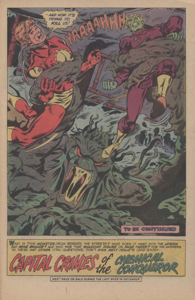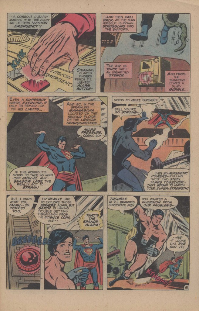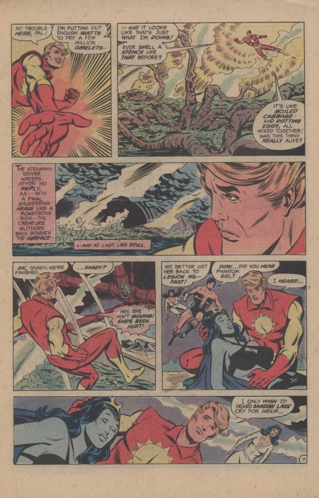 But Brande is able to hit a personal panic button and summon assistance from his young charges. At Legion HQ, Superboy and Cosmic Boy are exercising when the alert comes in, and they race off with Phantom Girl and Lightning Lad to rescue their benefactor. After they go, Sun Boy is thinking about how his flighty nature helped put Shadow Lass in the hospital as well as his disquietude concerning how Brainiac 5 has been acting of late. But before these thoughts can lead anywhere, the pair are accosted by the sewer creature, which has pursued them to their Headquarters and gained access to the place through its plumbing, the same as elsewhere.
