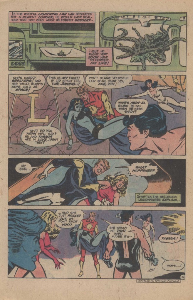 And sure enough, there’s some manner of gigantic sludge monster inhabiting these waters. Before the Legionnaires can detect it, it swats Shadow Lass out of the sky with its tentacles, then attacks the other Legion members. The Legionnaires conjecture that it may be some manner of biological weapon left over from the recent war with the Khund. The heroes, particularly Sun Boy, are able to drive the beast away, but they then see that Shadow Lass has been badly injured when the creature smashed her into the sewer wall. They race to get her to proper medical attention. Elsewhere, we get a fun (if perhaps bloated) two-page scene between newlyweds Lightning Lad and Saturn Girl as Garth attempts to make dinner for the pair for the first time. It’s a fun, humanizing scene, for all that, at two pages, it may be overlong. Just as events are getting hotter, Saturn Girl picks up telepathic news about what’s happened to Shadow Lass, and she and Lightning Lad head for Legion HQ. But as they go, a remnant of their uneaten dessert begins to move and grow.