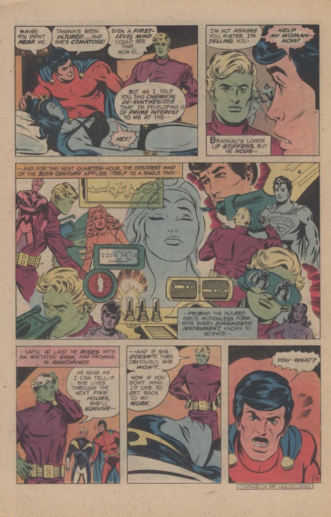 And as the issue wraps up, Sun Boy and Brainiac 5 fid themselves in the crushing grip of the beast. Now, this is maybe less of a cliffhanger than it first seems, given that Sun Boy was able to drive it away with his radiance abilities several pages earlier. But, hey, we’re at the end of the comic, we need something here. To Be Continued! I suspect one of the things that bugged me about the Legion is the fact that its take on future civilization lacked depth and consistency. The 30th Century still wasn’t a fully-realized world, it often just seemed like a reflection of modern times but with “space” added to common terms–space breakfast, space kitchen, space baseball, etc. It never really felt legitimate to me, so when stories were sent there, there was a feeling of performativeness about the entire adventure.