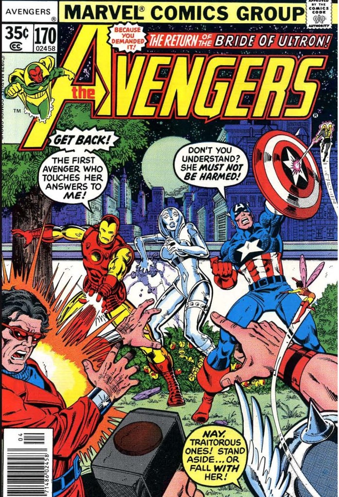 What brought me back was this issue, #170 and its follow-up, #171, both of which I bought at the same time. it turned out that I hadn’t even missed any story, as the issue in-between, #169, had been an emergency fill-in. Like so many Marvel titles of this period, AVENGERS was suffering from production problems. Anyway, this two-part battle against Ultron sealed the deal, and I became a regular AVENGERS reader moving forward.