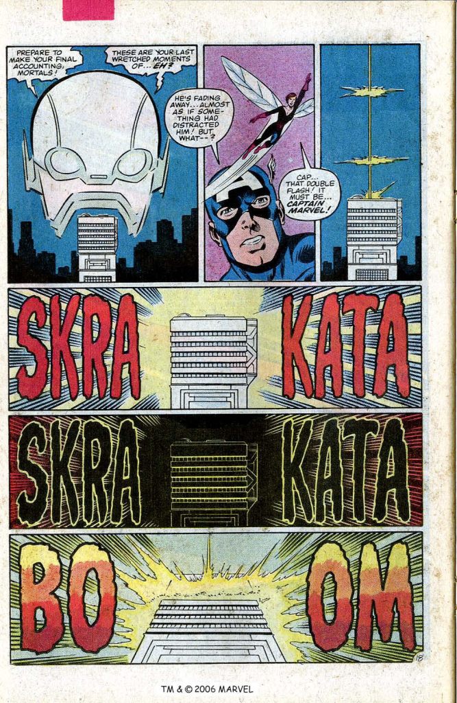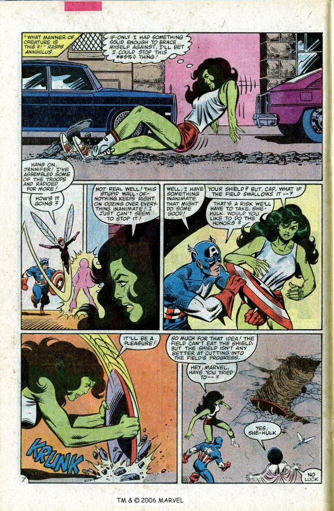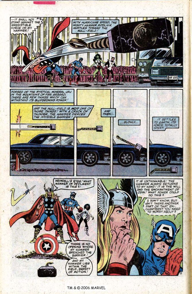 This final issue, #233, was the final straw. it was a part of a small crossover with FANTASTIC FOUR, in which John Byrne had been building up a storyline in which Annihilus had taken over the Baxter Building while the FF were stuck in the Negative Zone. This issue tells a Rashomon-like version of the same events as FANTASTIC FOUR #256, but from the point of view of the Avengers, who are on Earth. It’s a fun trick–but as all of the plot was being carried by FANTASTIC FOUR, the Avengers spend most of this issue trying to penetrate an invisible null-field that is expanding outward from the Baxter Building. A cool idea, but hardly breathless stuff. When Captain Marvel is eventually able to pierce the barrier by transforming herself into hard radiation and hurling herself at it from space, this coincides with the moment when the FF solve the problem from within the Negative Zone, so the whole involvement f the Avengers seems superfluous. This felt like empty calories to me, for all that it was fun (and for all that Byrne himself turned up to do breakdowns on this issue, repurposing a couple of pages from the contemporaneous FF issue.