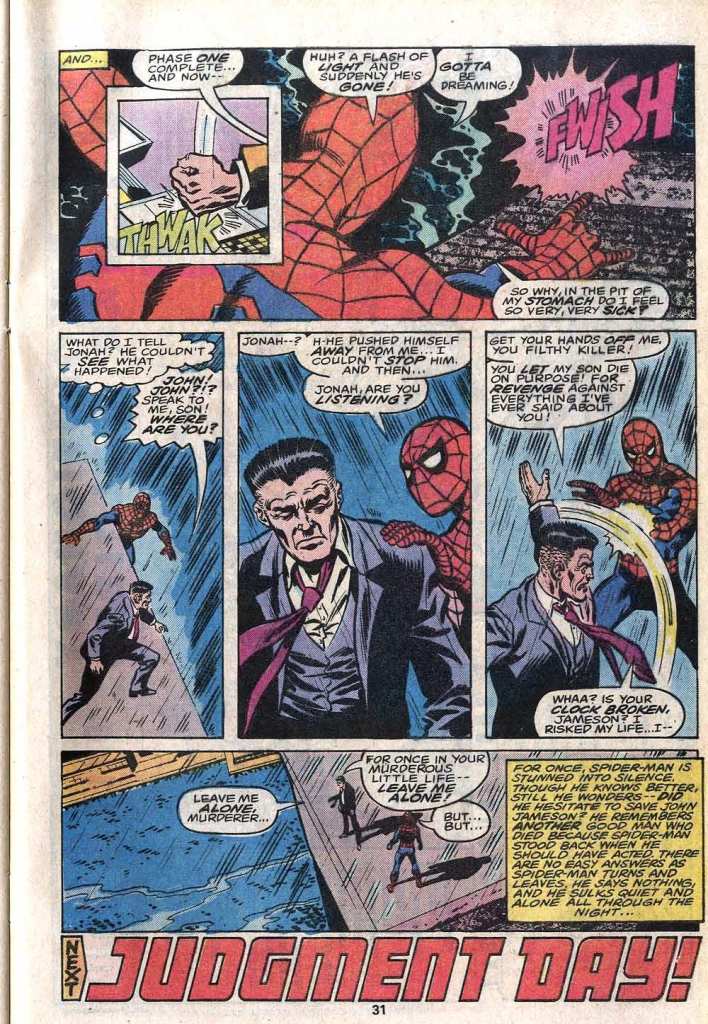 By this time, though, Spider-Man has plenty of personal experience with people being hurled off of bridges, and he leaps downward, grabbing John Jameson and stopping his fall. But Smythe isn’t finished yet, and as he presses a button, John vanishes in a burst of light. Is he dead? Teleported away? Spidey has no way of knowing. What’s more, Jonah didn’t see this happen, and so as the web-slinger returns to the top of the bridge empty-handed, Jameson lashes out at him for having allowed his son to die. I don’t know that this all quite lives up to the cover blurb promising an amazing surprise shock ending, but still it was relatively effective. Although Marv steps on the final moment a little bit with a last narrative caption that is positively massive and which gilds the lily of the moment a little bit.