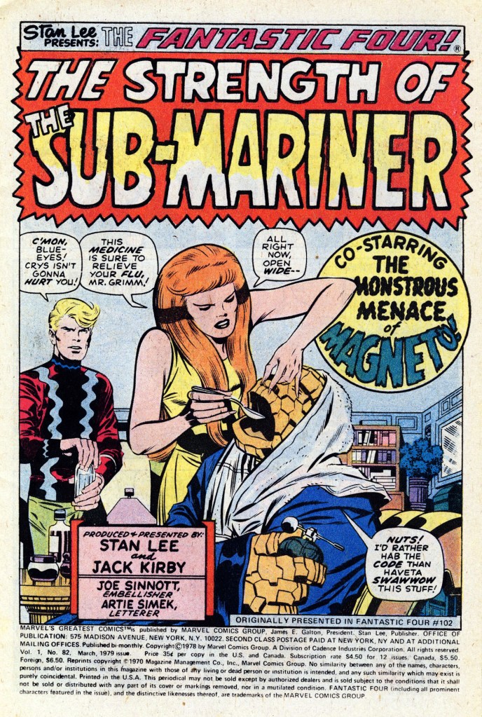 So what was this story about? Briefly, the Sub-Mariner, while on a scouting expedition to Antarctica, comes across the unconscious body of Magneto where he fell after battling the X-Men in a recent story. Namor conducts the Master of Magnetism back to Atlantis to recuperate, and there Magneto works out how to use Atlantean super-science to increase the strength and range of his magnetic powers. He tests his abilities from afar on Manhattan, getting the attention of the Fantastic Four. Reed traces the source of the recent difficulties back to Atlantis, and in a fit of anger, Ben Grimm launches a counter-attack missile at the city. It’s meant to be a harmless concussion missile, a warning shot, but Namor doesn’t know this, so he treats it as a sneak attack from the surface world. So Magneto is now pulling the strings, manipulating Namor and Atlantis into attacking humanity and the Fantastic Four, with him set to benefit from the conflict.