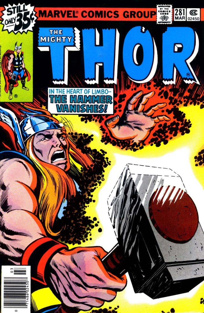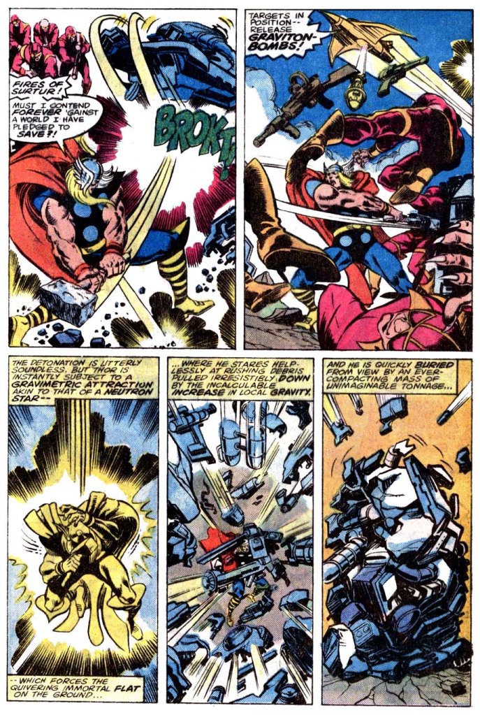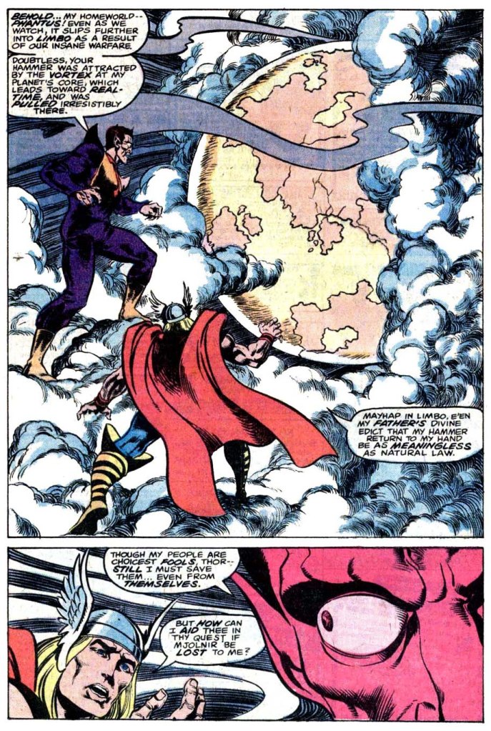 What follows is the issue’s action-quotient, a spectacular multi-page sequence adeptly illustrated by Keith Pollard and Pablo Marcos. Taking a page from another early Marvel Thor story, the Thunder God smashes an alien tank, compressing it down and forming it into a crude substitute for his missing hammer. It’s not as strong, of course, and it won’t return to him when he hurls it, but it feels good in his hand and gives him something to hit with. Eventually, Thor and the Space Phantom are able to fight their way to their objective: a Terminal Complex that contains a shaft that runs down into the planet’s core, to the juncture point where it is being pulled into Limbo.